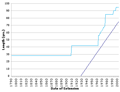 - Graph of the length of copyright, compared to the age of Mickey Mouse